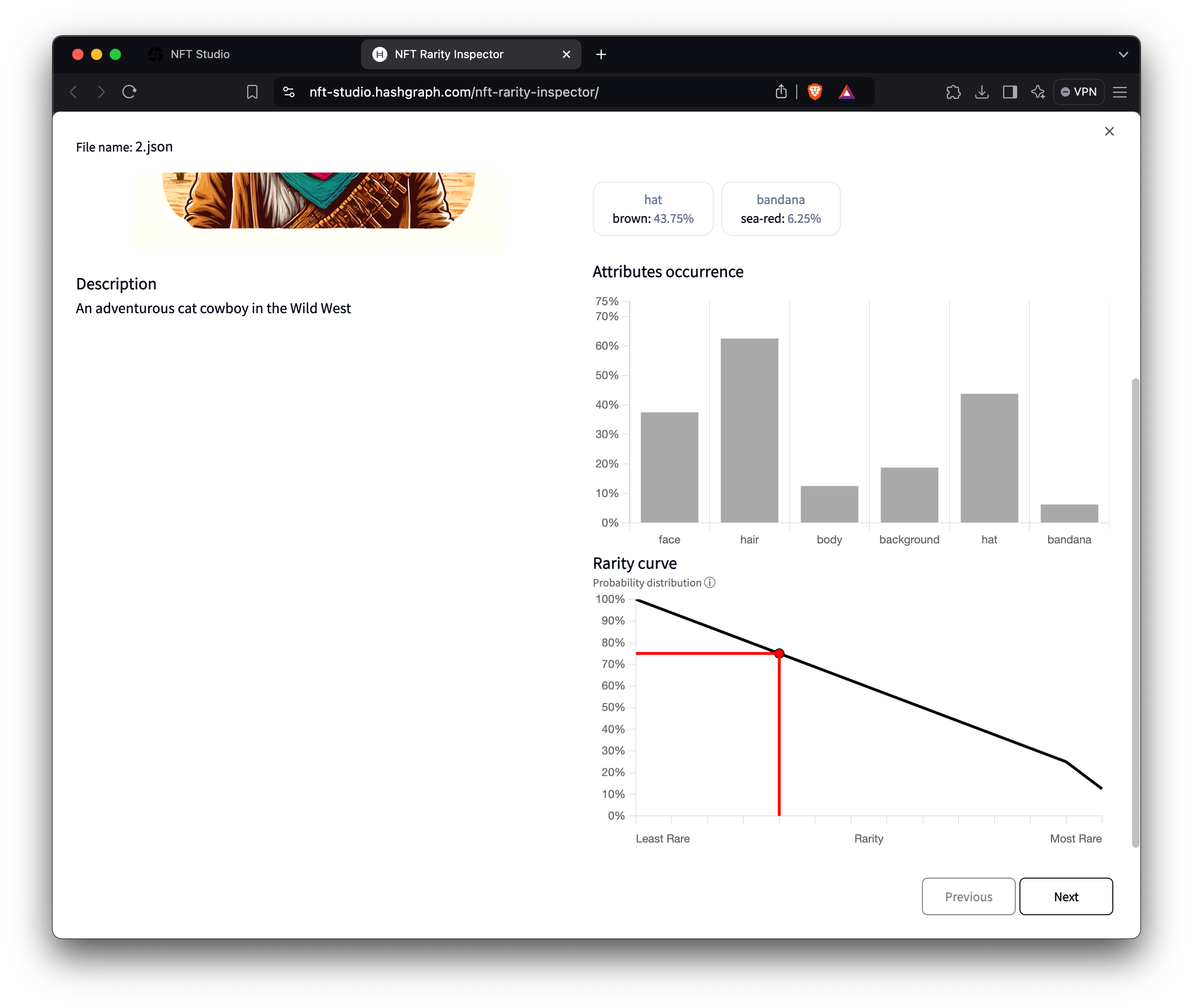 .zip file to verify NFT metadata and check for compliance with HIP-412 standards. It calculates a rarity score by analyzing the NFT’s traits, features, and properties compared to the entire collection. Once the inspection is complete, each NFT is assigned a rarity score based on its uniqueness, helping artists, collectors, and traders understand its value. The higher the score, the rarer and more unique the NFT, making it more valuable than those with lower scores.