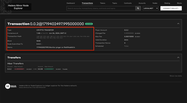 Visit the local mirror node explorer endpoint (http://localhost:8080/devnet/dashboard) in your web browser. Ensure that LOCALNET is selected, as this will show you the Hedera network running within your local network. Select any of the listed blocks to view the details (Consensus, Block, Transaction Hash, etc) for a particular block.
