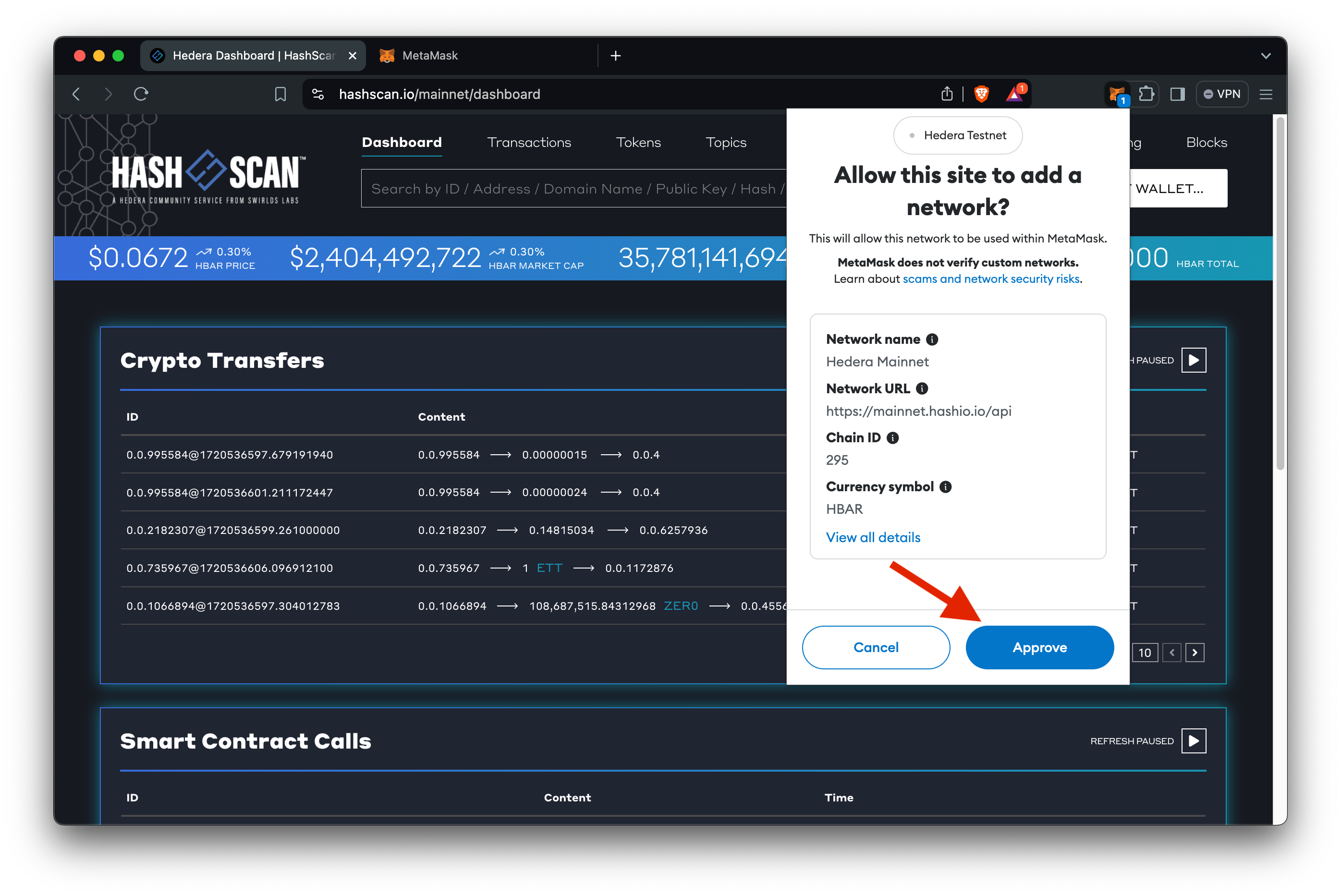 - If you haven’t added the Hedera network to MetaMask yet, HashScan will prompt you to add it.