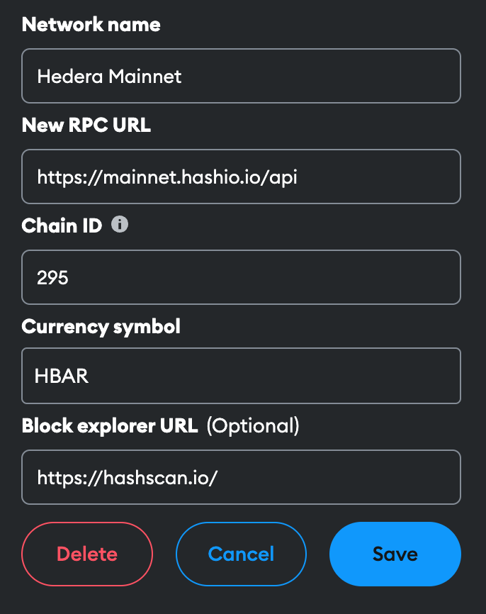 - Click Save to add the Hedera Mainnet to MetaMask.